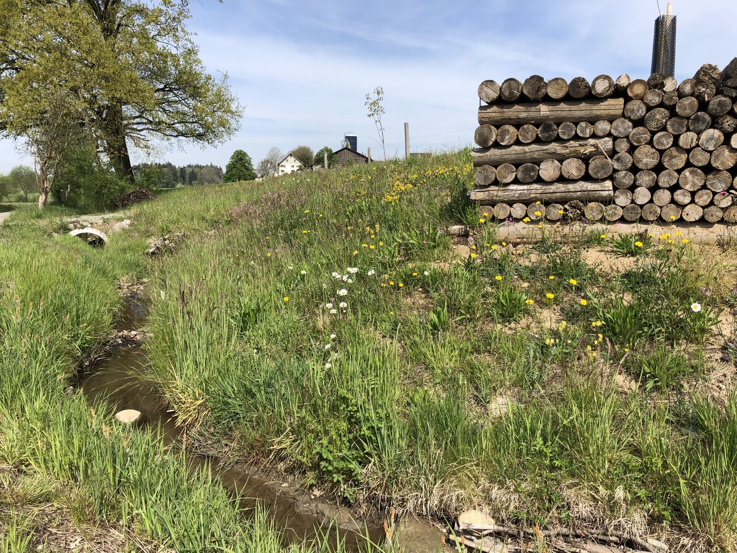 Bachlauf Zur Ausgestaltung des neuen Gerinnes wurden die vorhandenen Hartverbauungen aus Steinen und Betonrohren entfernt. Mit der Ausbildung einer leichten Pendelbewegung und der Schaffung vielgestaltiger Ufer- und Sohlenstrukturen wurde ein naturnaher Bachlauf mit typischer Wiesenbachcharakteristik modelliert. Die Gerinneführung orientierte sich an erhaltenswerten Elementen wie Uferbäumen und wertvollen Heckenstrukturen sowie den jeweiligen Platz- und Höhenverhältnissen. Als Bestandteil der Revitalisierungsplanung wurde neben einem neuen Auslaufbauwerk zusätzlich eine Überfahrt für die landwirtschaftliche Bewirtschaftung errichtet, welche den revitalisierten Bereich vom Ausdolungsabschnitt trennt.