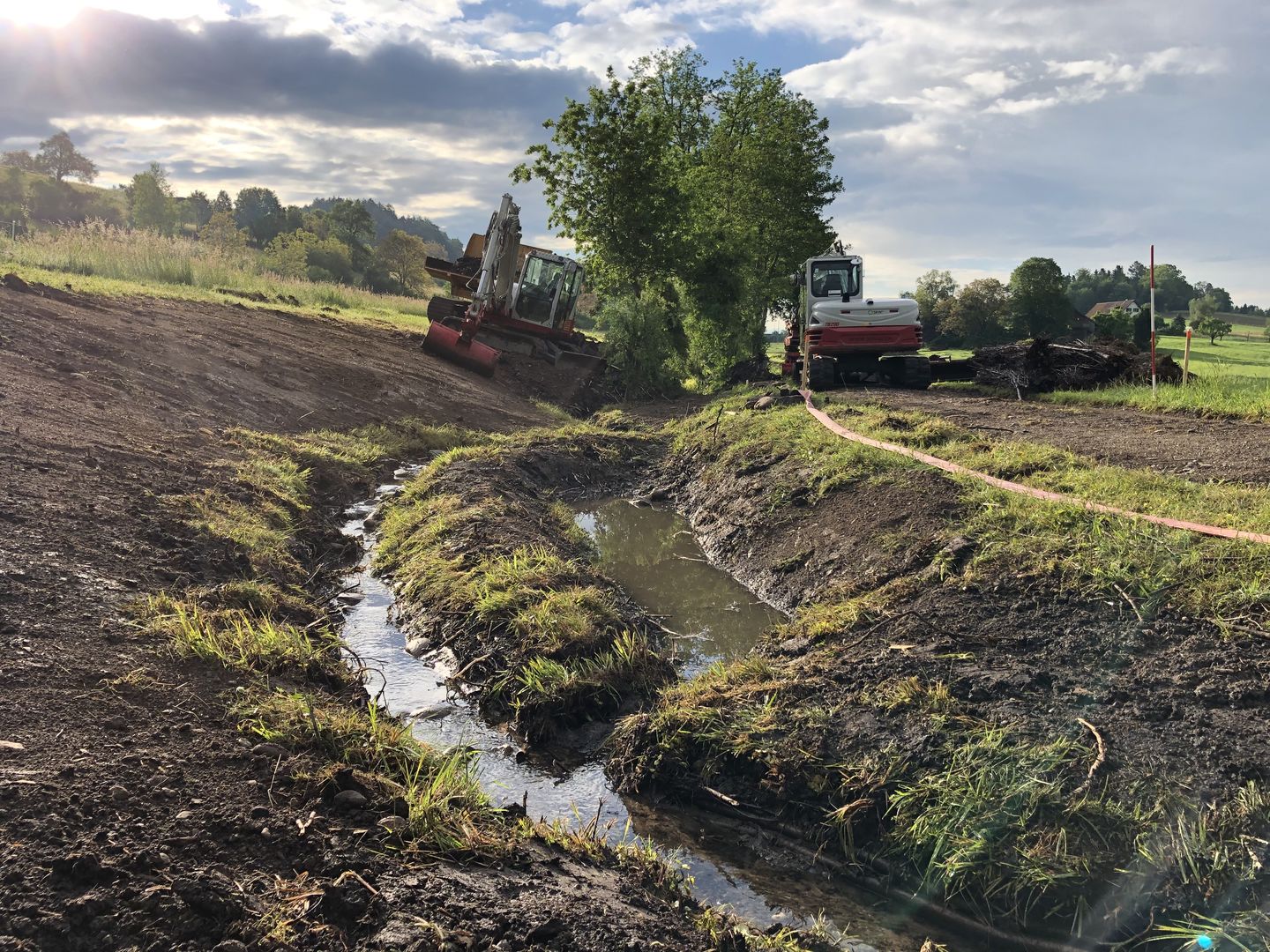 Die Revitalisierungsmassnahmen erfolgten zwischen Mai und August 2021 durch die Firma SKW AG, einem spezialisierten Unternehmen für naturnahen Wasserbau. Alle Arbeiten fanden in enger Zusammenarbeit mit den betroffenen Akteuren statt (Landwirt:innen, Flurgenossenschaft und kantonale Fachstellen). Auftauchende Fragen wurden im Rahmen eines wöchentlichen Jour fix mit allen Beteiligten besprochen und entsprechende Massnahmen festgelegt. Die Gesamtkosten belaufen sich auf 165 000 Franken inklusive der Entwicklungspflege während der ersten drei Jahre. Der Kanton beteiligt sich mit Beiträgen in Höhe von 82 000 Franken.