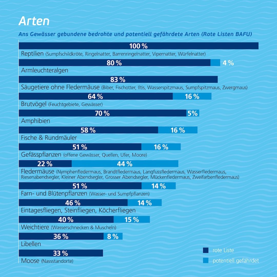 Gewässerlebensräume gelten als die am stärksten bedrohten Lebensräume der Schweiz. Moore haben zwischen 1900 und 2010 82 Prozent ihrer Fläche eingebüsst. Bei den Auen sind es seit 1850 sogar über 90 Prozent. 100 Prozent der Stillgewässer-Lebensraumtypen stehen auf der Roten Liste und bei den Fliessgewässern gelten lediglich noch rund fünf Prozent als mehr oder weniger intakt. Das ist zu wenig und hat zu einem dramatischen Artensterben in und entlang unserer Gewässer geführt. Die Schweiz kann es sich nicht länger leisten, intakte Gewässerlebensräume an die Stromproduktion, die Landwirtschaft oder die Siedlungsentwicklung zu verlieren.