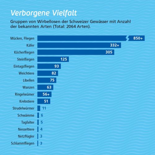 Wirbellose Tiere der Gewässer, die man mit blossem Auge erkennen kann, nennt man Makroinvertebraten, abgeleitet vom griechischen makros = gross und dem lateinischen in = ohne und vertebra = Wirbel. Die allermeisten besiedeln ausschliesslich den Gewässerboden (Benthal), weshalb man auch vom Makrozoobenthos spricht. Von den Würmern bis zu den Insekten sind in der Schweiz bis heute mehr als 2000 Arten nachgewiesen, die entweder ganzjährig in Gewässern leben oder nur einen Teil ihres Lebenszyklus‘ darin verbringen. Die grösste Anzahl entfällt dabei auf Mücken und Fliegen. Weil verschiedene Insekten-Gruppen nicht oder nur ungenügend untersucht worden sind, dürfte das nur eine grobe Schätzung der tatsächlichen Artenvielfalt unserer Gewässer sein.