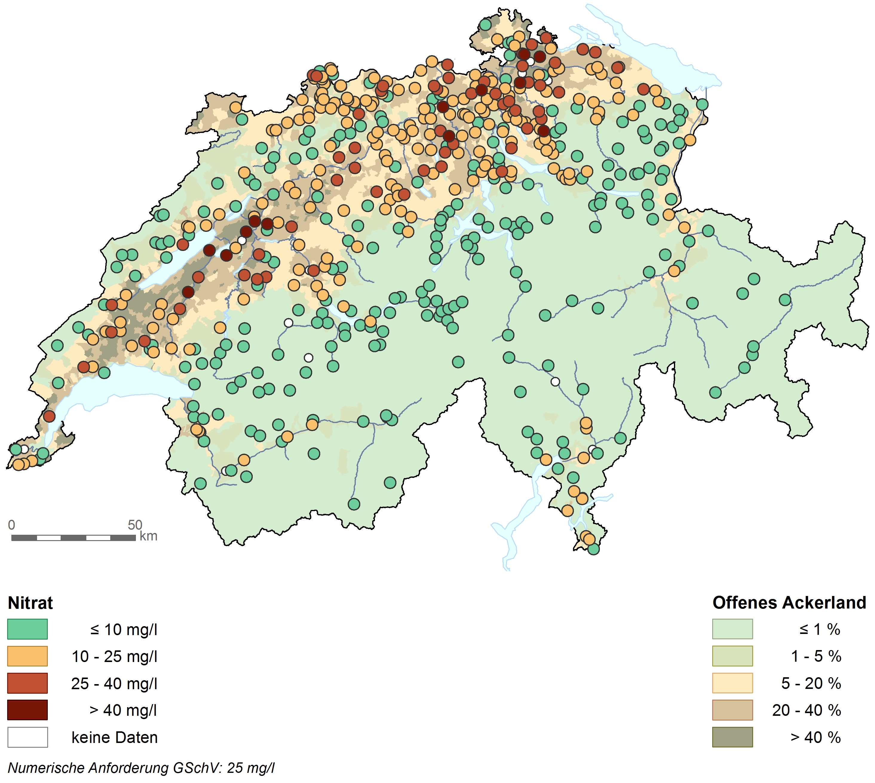 Das Gewässerschutzgesetz verlangt, dass in Bächen von keinem organischen Pestizid Konzentrationen über 0,1 μg/L vorkommen. Für einige Stoffe gelten seit einem Jahr sogar deutlich strengere Werte, für ganz wenige auch höhere. Diese Grenzwerte werden im Mittelland und im Grundwasser regelmässig und oft über Monate hinweg nicht eingehalten. Auch bei den Nährstoffen ist vieles im roten Bereich: Die Nitratkonzentrationen im Grundwasser übersteigen in Ackerbaugebieten an 40 Prozent aller Messstellen den Grenzwert von maximal 25 mg/L.